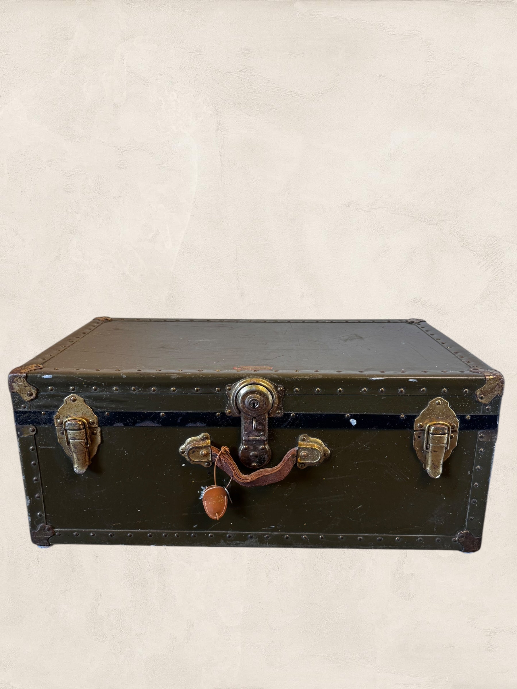 This WWII relic carries grit — with worn leather straps and aged brass hardware that only add to her charm. A great addition to your living space, weather your storing treasures or using her as a side table.
