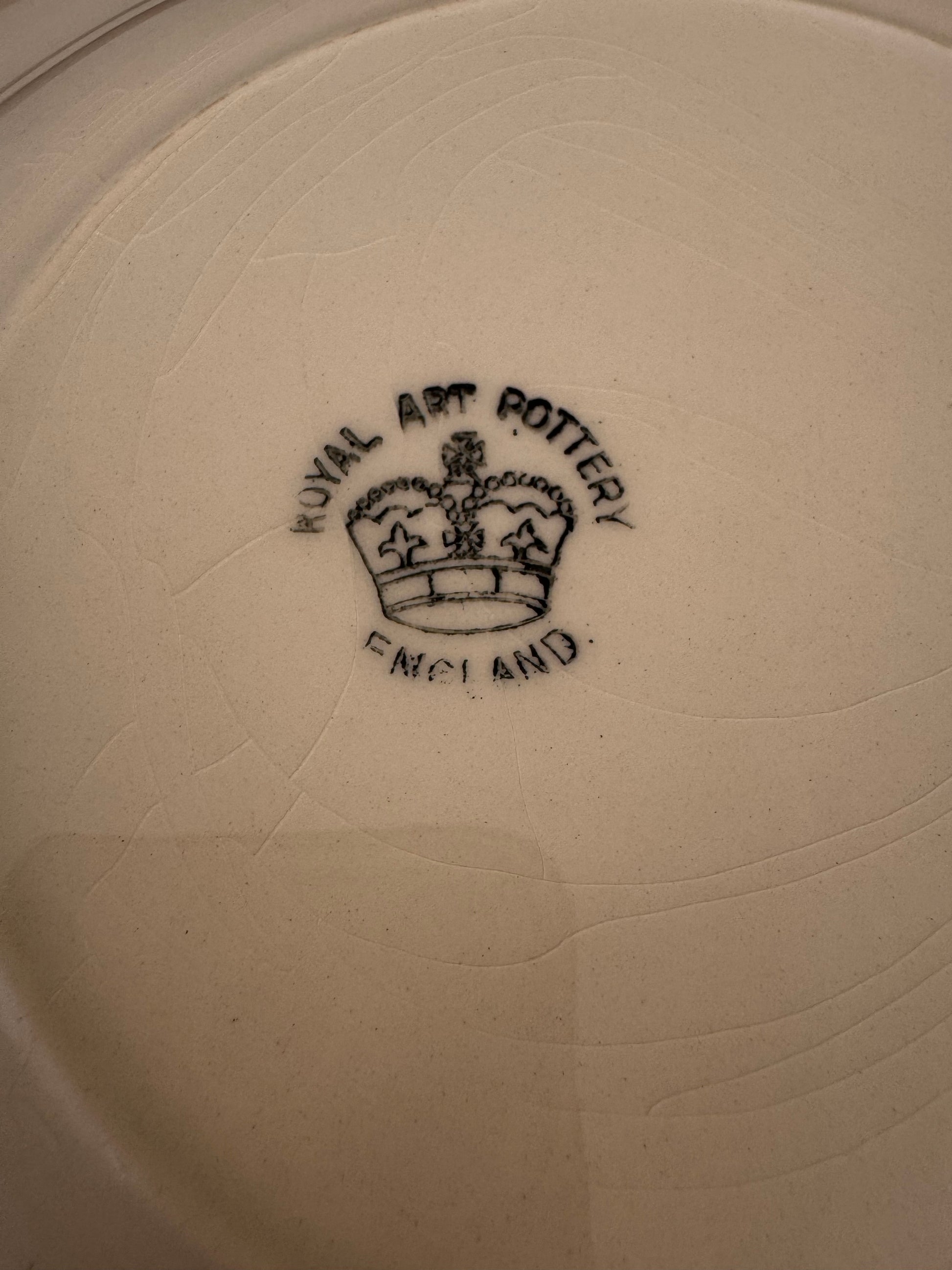 A vintage set of 6 Royal Art Pottery England ironstone plates in an antique white.